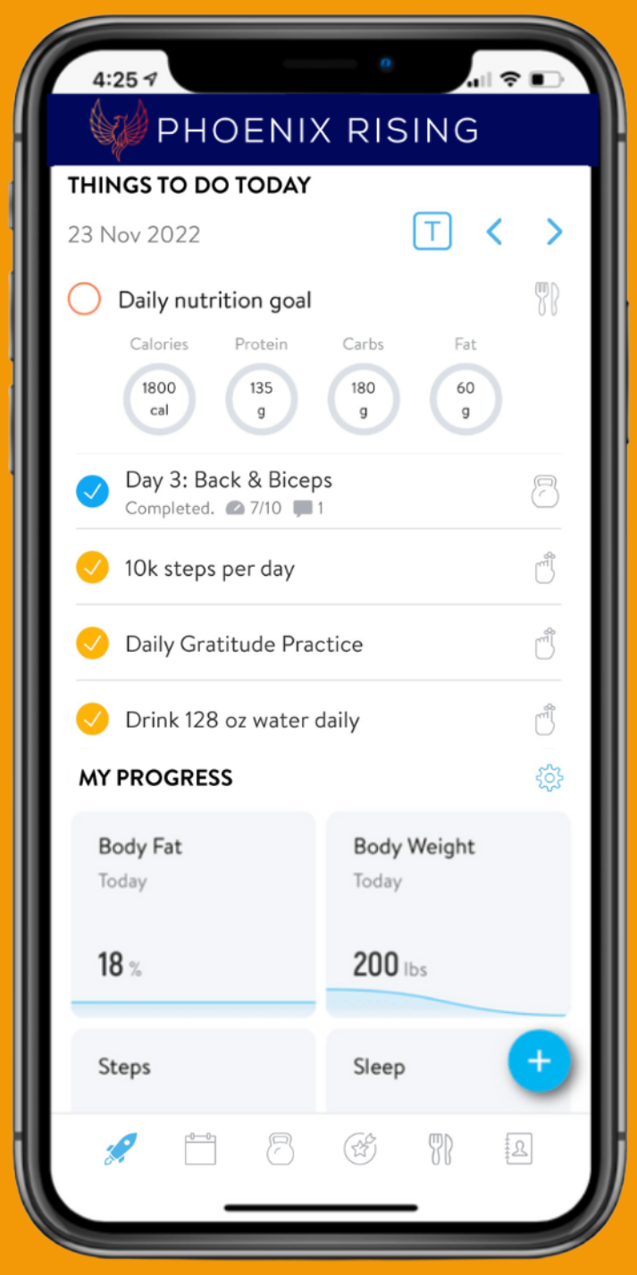 Phoenix Rising is an app-based health & wellness program centered around strength training, flexible dieting, mindset coaching, regeneration, and connection.